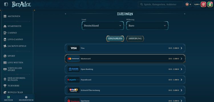 Für Ihre Einzahlung können Sie zwischen 22 Methoden wählen, welche alle eine Mindesteinzahlung von 10€ verlangen. Zu den Methoden gehören neben Kryptos, Kreditkarten, klassische Banküberweisungen und E-Wallets wie Jeton und MiFinity.