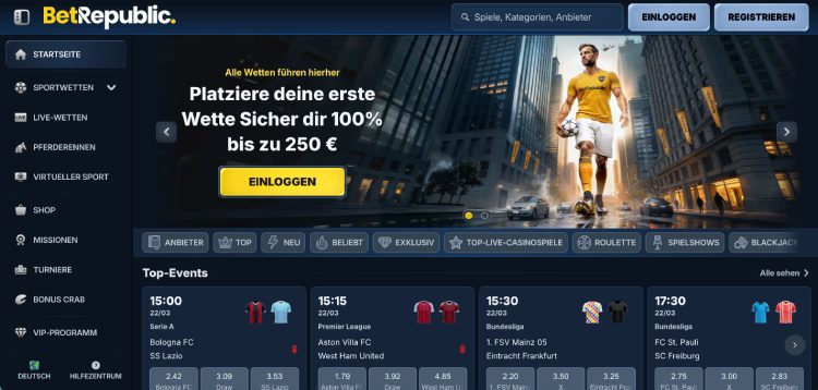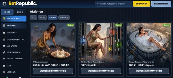 Das BetRepublic eignet sich für Casino und Sportwetten Fans, da beide Bereiche sehr gut abgedeckt sind. Hier werden Sie nicht nur mit einer großen Auswahl verwöhnt, sondern auch mit reichlich Bonusangeboten.