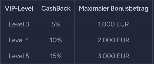 Sie haben in einer Woche Verluste hinnehmen müssen? Dann können Sie über das Cashback-Programm einen Teil davon wieder zurückerhalten. Um sich dafür zu qualifizieren, muss allerdings mindestens das dritthöchste VIP-Level erreicht worden sein. Die Ausschüttung erfolgt immer montags, sofern mindestens 5€ Cashback angesammelt wurden.