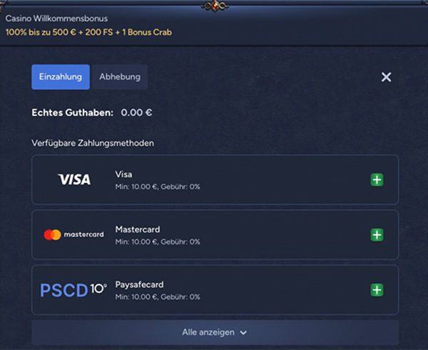 Sie haben bei Ihren Einzahlungen die Wahl aus verschiedenen Methoden. Darunter Kreditkarten, Überweisung, E-Wallets (Revolut, Jeton), Paysafecard und Kryptowährungen wie Bitcoin, Ripple und Dash.
