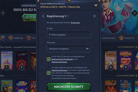 | Bonus 1. Einzahlung | 100% bis 500€ 200 Freispiele + 1 Bonus Crab |