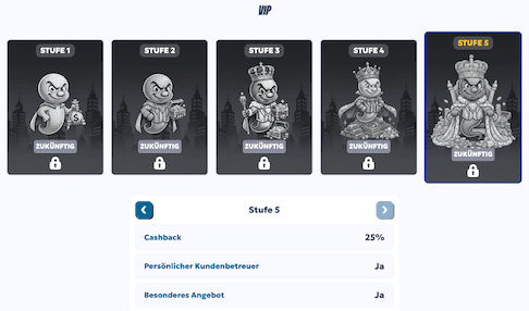 Das VIP-Programm belohnt regelmäßiges Spielen und wurde sehr klassisch gehalten. Sie können durch regelmäßiges Spielen mit echtem Geld fünf Stufen aufsteigen und verdienen sich damit jedes Mal neue und bessere Vorteile, welche verbesserte Zahlungslimits, individuelle Bonusangebote, persönliche Ansprechpartner und mehr beinhalten.