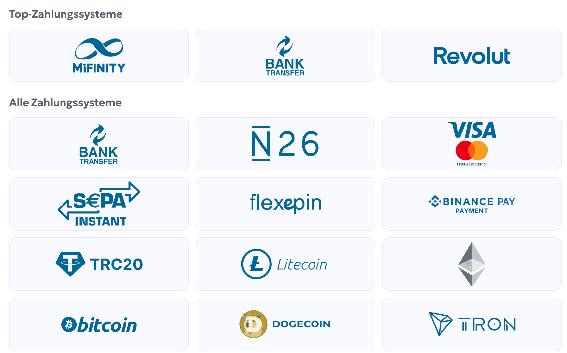 | Zahlungsmethode | Mindesteinzahlung | Auszahlungsdauer | Gebühren |