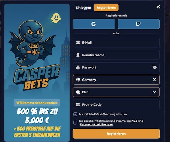 Die Registrierung geht sehr schnell vonstatten, da zunächst noch keine persönlichen Angaben gemacht werden müssen. Dieser Schritt erfolgt stattdessen vor der ersten Einzahlung. Sie können sich die Registrierung besonders einfach machen, wenn Sie ein Google- oder Twitch-Konto haben. Dann können Sie den Login zum jeweiligen Konto nämlich ganz einfach für die Anmeldung bei Casperbets nutzen.