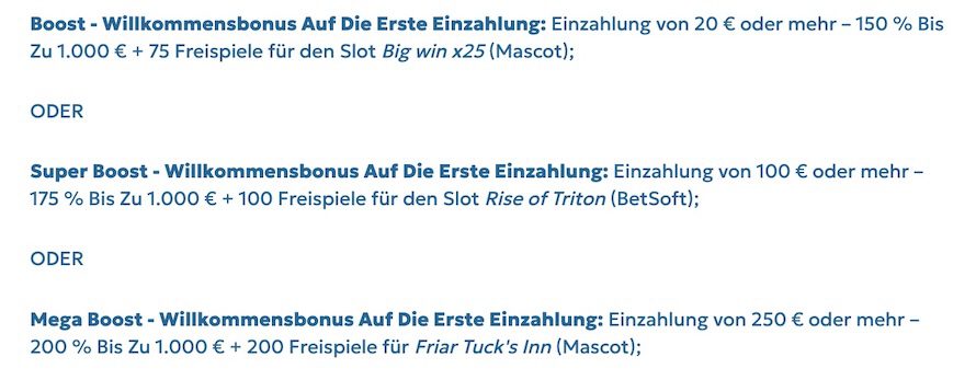 | Bonus 1. Einzahlung | 150% bis 1.000€ + 75 Freispiele |
