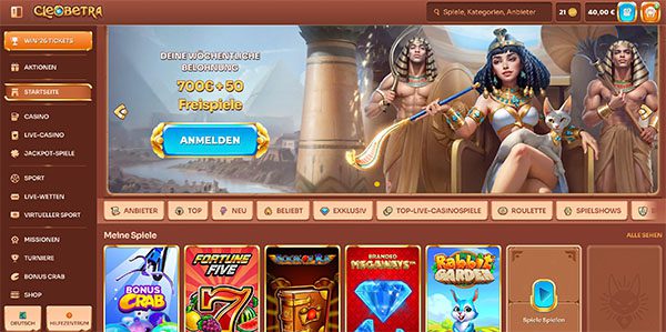 Wir haben in unserem Test ausführliche Cleobetra Casino Erfahrungen gesammelt. Bei dem Wortspiel im Namen, wird das Thema direkt ersichtlich. Die gesamte Website ist von ägyptischen Elementen durchzogen. Wie es hinter dieser gelungenen Fassade aussieht, lesen Sie hier in unserem Cleobetra Test.
