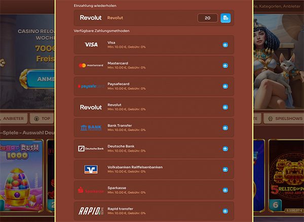Bei den Casino Zahlungsmethoden können Sie auf Online-Banking, E-Wallets und Kryptowährungen zurückgreifen. Praktischerweise sind auch Zahlungen mit Paysafecard möglich. Uns ist positiv aufgefallen, dass Einzahlungen schon ab 10 Euro möglich sind.