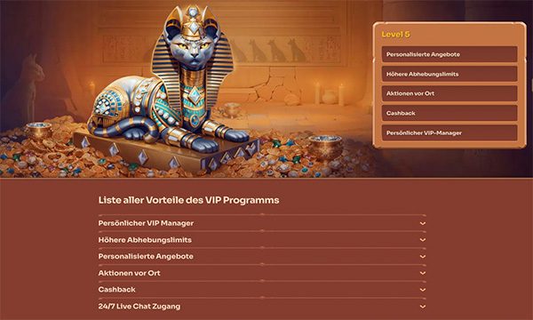 Wenn Sie regelmäßig mit echtem Geld spielen, können Sie sich bei Cleobetra verschiedene Vorteile erspielen. Dafür ist das fünfstufige VIP-Programm da. Je besser die Stufe, desto besser sind auch die Prämien und Vorteile.