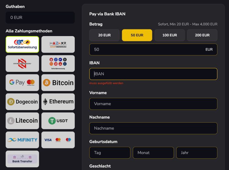 Im Kassenbereich finden Sie klassische Banküberweisungen, Kreditkarten und vor allem Kryptowährungen. Das Limit liegt bei fast allen Methoden bei 20€. Hier machen nur Sofortüberweisungen den Unterschied mit einer Mindesteinzahlung von nur 10€.