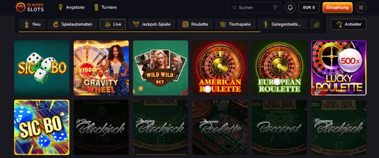 Im Live Casino von Dundeeslots können Sie mit echten Dealern spielen. In unserem Test liefen alle Spiele reibungslos und schnell. Im Live Casino finden Sie keine weiteren Filterfunktion, daher lohnt es sich hier zu stöbern.