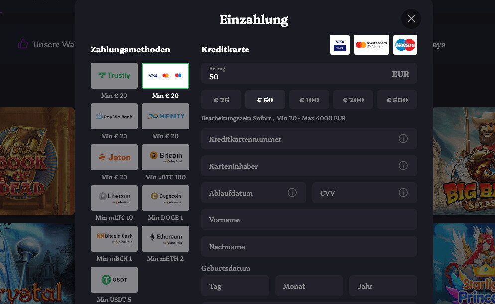 Wenn Sie eine Einzahlung vornehmen möchten, dann können Sie auf verschiedene Casino Zahlungsmethoden zurückgreifen, die Kreditkarten, Überweisungen, E-Wallets und auch Kryptos umfassen.