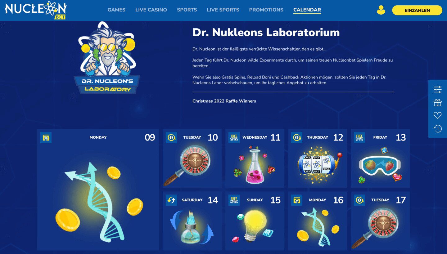 Das VIP-Programm, welches Spieler für ihre Treue belohnt, wurde sichtlich mit Hingabe gestaltet. Unter anderem ist Dr. Nukleon ein Cashback Casino. Das Laboratorium bietet aber auch gesonderte Boni und andere Vorteile. Es handelt sich dabei um einen Kalender, sodass Sie als Teilnehmer des VIP-Programms von Nucleonbet jeden Tag auf neue interessante Angebote wie Freispiele und anderes hoffen dürfen.
