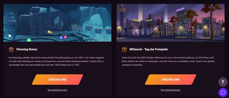 Jeden Dienstag können Sie sich einen zusätzlichen 100% Einzahlungsbonus von bis zu 100€ sichern. Auch hier gilt eine Mindesteinzahlung von 20€, wie beim Willkommenspaket.