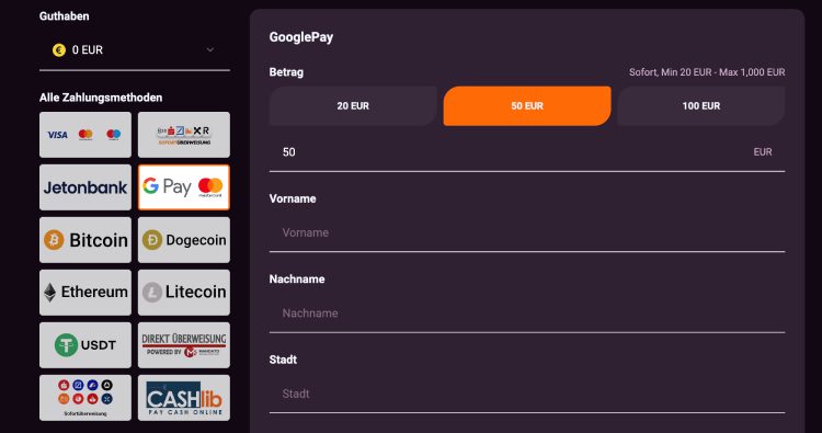 Der Kassenbereich hat einiges an beliebten Methoden, wie Cashlib oder Jeton zu bieten. Auch Kryptowährungen sind vorhanden. Wir haben in unserem Test eine Einzahlung per Kreditkarte gewählt und konnten unser Geld ohne Probleme einzahlen.
