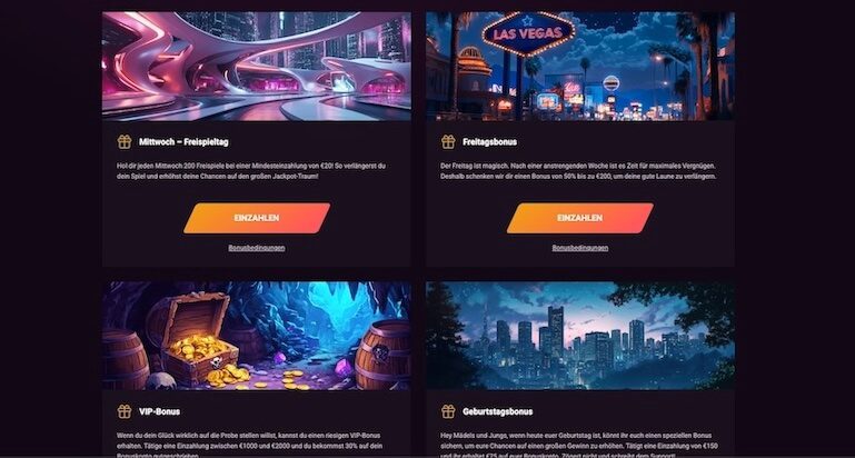 Die Bonuslandschaft ist im Ronycasino gut gefüllt. Es gibt nicht nur drei wöchentliche Reload-Boni am Dienstag, Mittwoch und Freitag, sondern auch einen Geburtstagsbonus und VIP-Boni, die über das Treueprogramm verdient werden können.