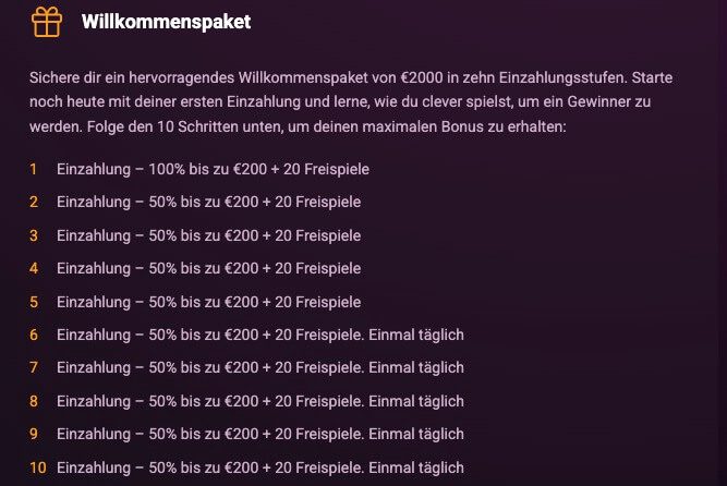 Wir haben mittlerweile zahlreiche Online Casinos getestet. Ein so umfangreiches Begrüßungsprogramm ist uns in all den Jahren aber noch nicht untergekommen. Das Wort Willkommenspaket wurde hier nämlich wörtlich genommen. So können sich neue Spieler nach der Registrierung nacheinander zehn (!) Boni abholen, jeweils an eine Einzahlung von mindestens 20€ gekoppelt.