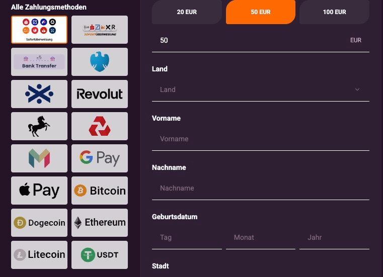 Um Ihr Konto erstellen zu können, müssen Sie volljährig sein. Der Anmeldeprozess selbst geht einfach und schnell vonstatten. Einfach Ihre E-Mail-Adresse und ein Passwort eingeben. Ihre persönlichen Daten müssen Sie erst eingeben, wenn Sie Ihre erste Einzahlung vornehmen möchten.