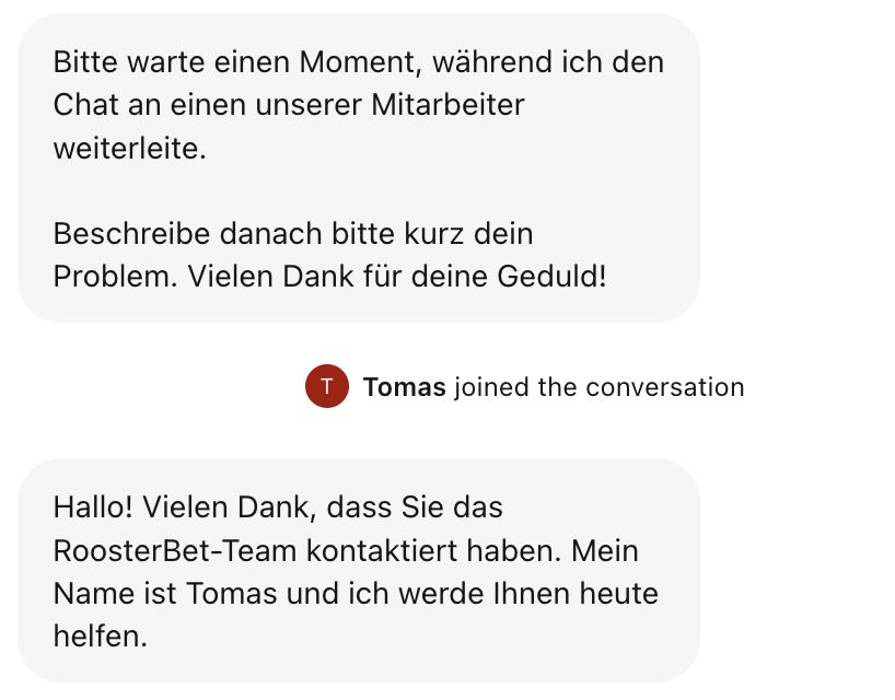 Wir haben den Kundenservice für unseren Rooster Bet Test kontaktiert, um zu schauen, ob schnelle und kompetente Hilfe in Sicht ist. Und das können wir bestätigen. Der Live-Chat bietet zwar zunächst vorgegebene Antwort-Buttons, im Zweifel kann man sich dann aber auch einfach mit einem echten Mitarbeiter verbinden lassen. Mit dem Kontakt haben wir gute Rooster Bet Erfahrungen gemacht. Alternativ zum Live-Chat können Sie aber auch eine Mail an support@rooster.bet schicken oder das Formular auf der Website des Casinos nutzen, welches sich im Hilfecenter befindet.