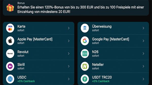 | Bonus 1. Einzahlung | 120% bis zu 300€ + bis zu 100 Freispiele |