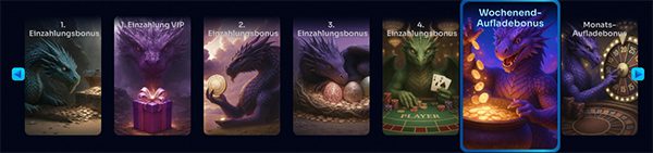 Der Reload-Bonus zum Wochenende kommt in zwei Varianten. Wenn Sie mindestens 20€ einzahlen, erhalten Sie einen Spin Dragons Bonus von 70% bis 700€. Wenn Sie mindestens 50€ einzahlen, kommen auch noch 70 Freispiele hinzu. Die Besonderheit: Sie können den Bonus am Wochenende unbegrenzt oft erhalten.