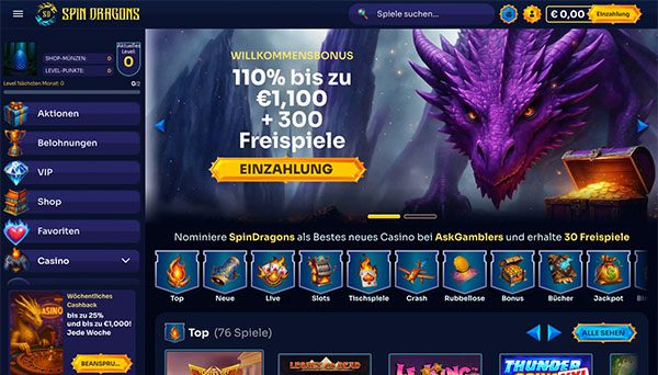 Das Spielangebot des Spin Dragons Casinos umfasst tausende Spiele, die verschiedene Geschmäcker ansprechen. Egal, ob Sie auf klassische Spielautomaten, Tischspiele oder Spiele im Live-Format aus sind.