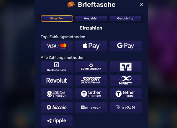 Ein Blick auf die Zahlungsmethoden hat bei uns für Freude gesorgt. Mit Apple Pay und Google Pay werden nämlich zwei sehr praktische Methoden gelistet, die schnelle Transaktionen versprechen. Es gibt aber auch klassische Methoden wie Online-Banking, E-Wallets und Kryptos. Dies ist ein Casino mit 10 Euro Einzahlung. Solche eher niedrigen Mindestsummen begrüßen wir.