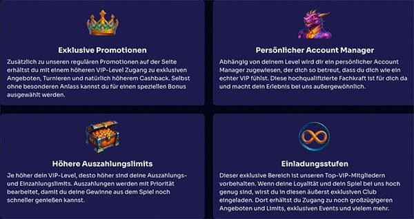 Sobald Sie sich registriert haben, nehmen Sie automatisch am VIP-Programm teil. Und können mit Echtgeld-Einsätzen Ihren Rang verbessern.